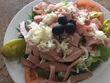 Fresh greens together with tomatoes, black olives, pepperoncini, salami, mortadella & mozzarella cheese.