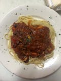 Fresh chicken breast & mushrooms sauteed in a marsala wine sauce served with a side of spaghetti with meat sauce.
